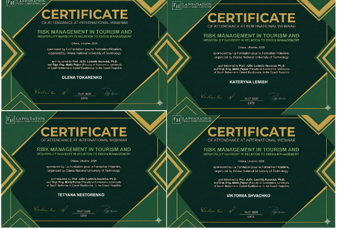 Спікерами вебінару виступили Prof. JUDr. Ludmila Novacká, Ph.D., професорка Університету Південної Богемії (Чехія), експертка з управління туристичними дестинаціями та реалізації міжнародних проєктів, а також Dipl. Eng. Matěj Pejsar, дослідник і викладач, фахівець з розвитку туристичних дестинацій і стратегічного планування (Чехія). Захід було організовано за підтримки La Fondation pour la Formation Hôtelière (Швейцарія) у співпраці з Одеським національним технологічним університетом (кафедра готельно-ресторанного бізнесу).