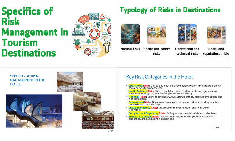 Програма вебінару охоплювала аналіз понять кризи, загроз і ризиків у сфері туризму та гостинності, розгляд специфіки управління ризиками в туристичних дестинаціях і готельному бізнесі, а також особливостей ризик-менеджменту під час організації подієвих заходів на основі практичних кейсів.