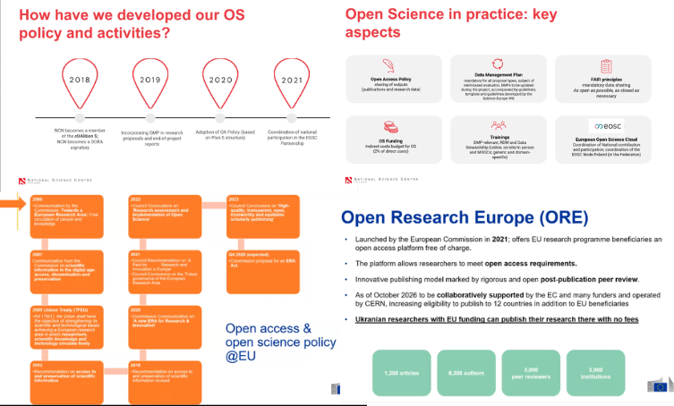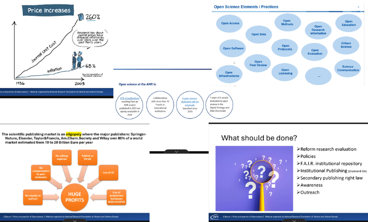 У межах вебінару було розглянуто сучасні підходи до формування та реалізації політик відкритої науки (Open Science), зокрема питання забезпечення відкритого доступу до результатів наукових досліджень, управління дослідницькими даними (Research Data Management), дотримання принципів прозорості та підзвітності у процесах грантового фінансування, а також критерії оцінювання наукових проєктів відповідно до європейських стандартів.