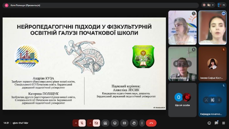 Під час пленарного засідання вони на високому рівні представили результати власних наукових пошуків. Зокрема, здобувачка першого (бакалаврського) рівня Анастасія БУТ виступила з доповіддю, присвяченою використанню ізотерапії як засобу розвитку емоційного інтелекту здобувачів початкової освіти (науковий керівник – доцентка Марина Нестеренко). Магістрантка Катерина Поліщук представила дослідження щодо розвитку навичок співпраці й емоційного інтелекту під час розв’язання STEAM-кейсів (науковий керівник – доцентка Крістіна Петрик), а також спільно з Андріаном Кузою презентувала доповідь про нейропедагогічні підходи у фізкультурній освітній галузі (науковий керівник – доцентка Анжеліка Лесик). Також у роботі конференції взяли участь магістрантки Діана Охрименко з доповіддю про вплив штучного інтелекту на когнітивну стійкість та академічну доброчесність здобувачів нового покоління (науковий керівник – асистентка Карина Коваль) та Ірина Скляр, яка порушила проблему розвитку критичного мислення в умовах інформаційного перевантаження (науковий керівник – доцентка Крістіна Петрик.