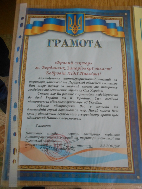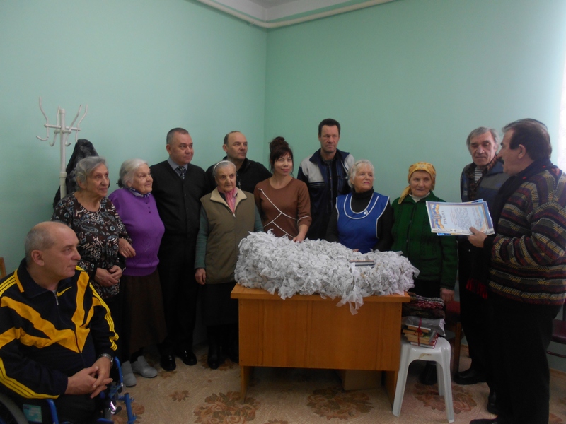 Сьогодні, 27 грудня, університетські «нашоатлантівці» Степан Герилів та Володимир Фуклєв побували в Бердянському геріатричному  пансіонаті, де знову мали приємну зустріч  із добрими його мешканцями, які об`єдналися в працьовитий колектив під досить оригінальною – назвою “Бравий Сектор».  Побували із кількома місіями: щоби привітати із новорічно-різдвяними святами, вручити їм заслужену  Грамоту від імені начальника штабу – першого заступника керівника Антитерористичної операції на території Донецької та Луганської областей генерал-майора Б. В. Бондаря за волонтерські заслуги (див. світлини); щоб отримати від невтомних жіночок недавно вив`язані велику маскувальну сітку та шкарпетки  для передачі хлопцям на фронт…