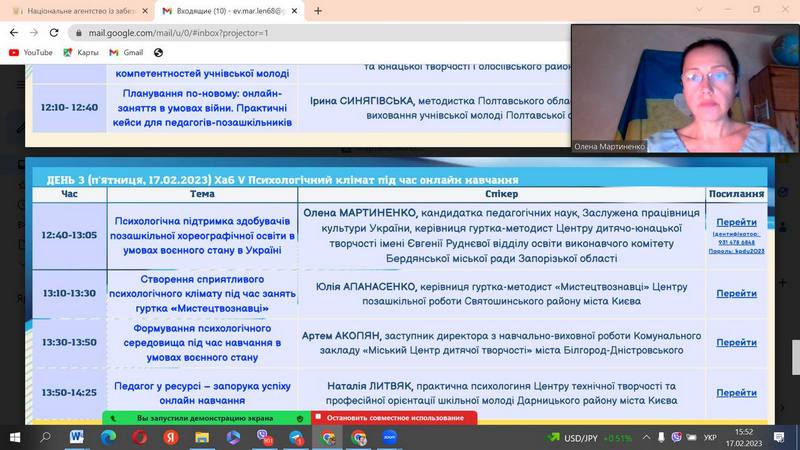 У рамках цього заходу було представлено актуальні теми роботи закладів позашкільної освіти, що корелюється зі змістом однієї з важливих освітніх компонент професійної підготовки хореографів «Теорія та методики роботи з хореографічним колективом» за ОП «Хореографія», ОП «Середня освіта (Хореографія). Фітнес». Здобувачі вищої освіти мали змогу обрати та прослухати виступи спікерів, які є фахівцями-практиками з наступних напрямів: «Проєктне навчання в освітньому просторі сучасного закладу позашкільної освіти», «Психологічний клімат під час онлайн-навчання», «Цифрові компетентності і цифрові навички нового покоління», «Спілкування в Інтернеті або мережевий етикет вихованців», «Кейсовий метод – ефективний спосіб формування життєвих компетентностей вихованців». Досвід і матеріали, якими поділилися практики, є важливим інформаційним джерелом, що визначає вимоги сьогодення та окреслює основні задачі професійної підготовки фахівців.