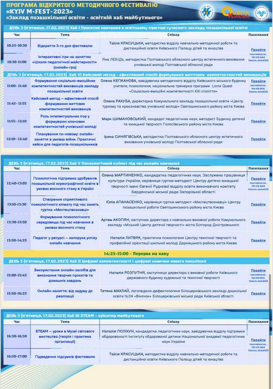 Протягом трьох днів із 15 по 17 лютого проходив відкритий методичний фестиваль«КYIV M-FEST-2023»: «Заклад позашкільної освіти – освітній хаб майбутнього», організований Київським Палацом дітей та юнацтва.