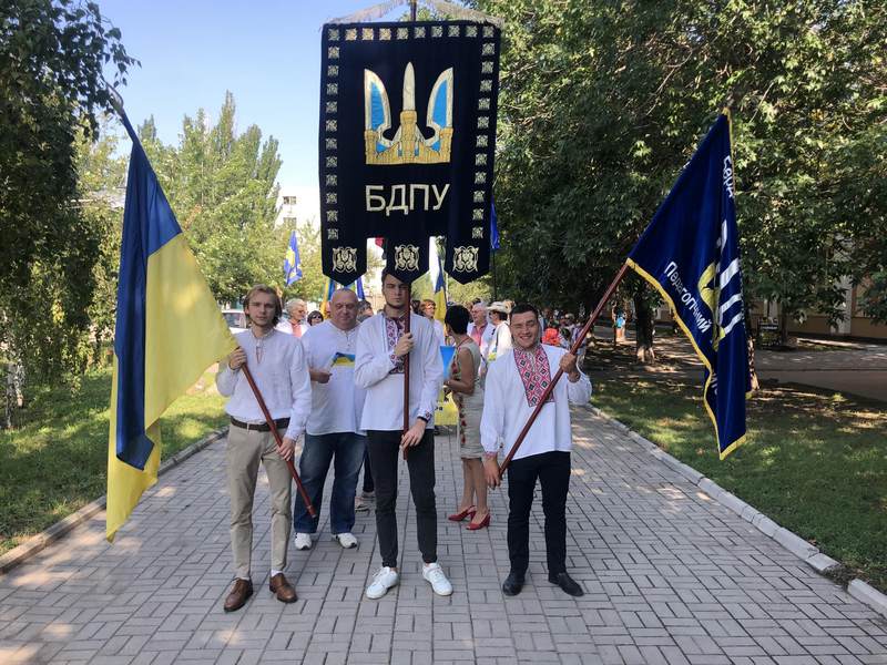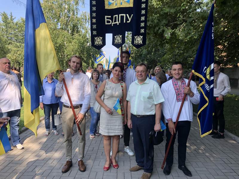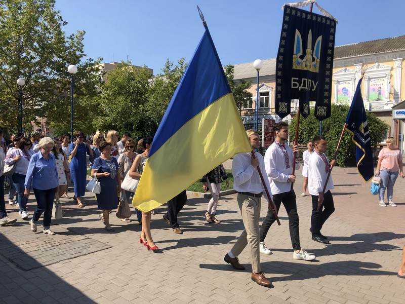Військовослужбовці та ветерани теперішньої російсько-української війни, представники влади, науковці та службовці урочистою ходою під супроводом оркестру, з державною символікою в руках пройшли до площі Єдності. У святковому марші взяла участь і колона викладачів та студентів Бердянського державного педагогічного університету, очолювана ректором, професором Ігорем Богдановим.