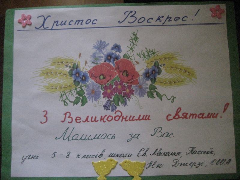 …Щойно "летунська" пошта доставила університетським «нашоатлантівцям» конверт із далекого американського міста Пассейку. В ньому – 33, виготовлені власноруч учнями 5-8 класів української школи, аплікаційні писанки – для воїнів АТО (див. світлини). Зворушує те, що маленькі, але такі чуйні серденька маленьких українських американців переймаються бідою рідної України…