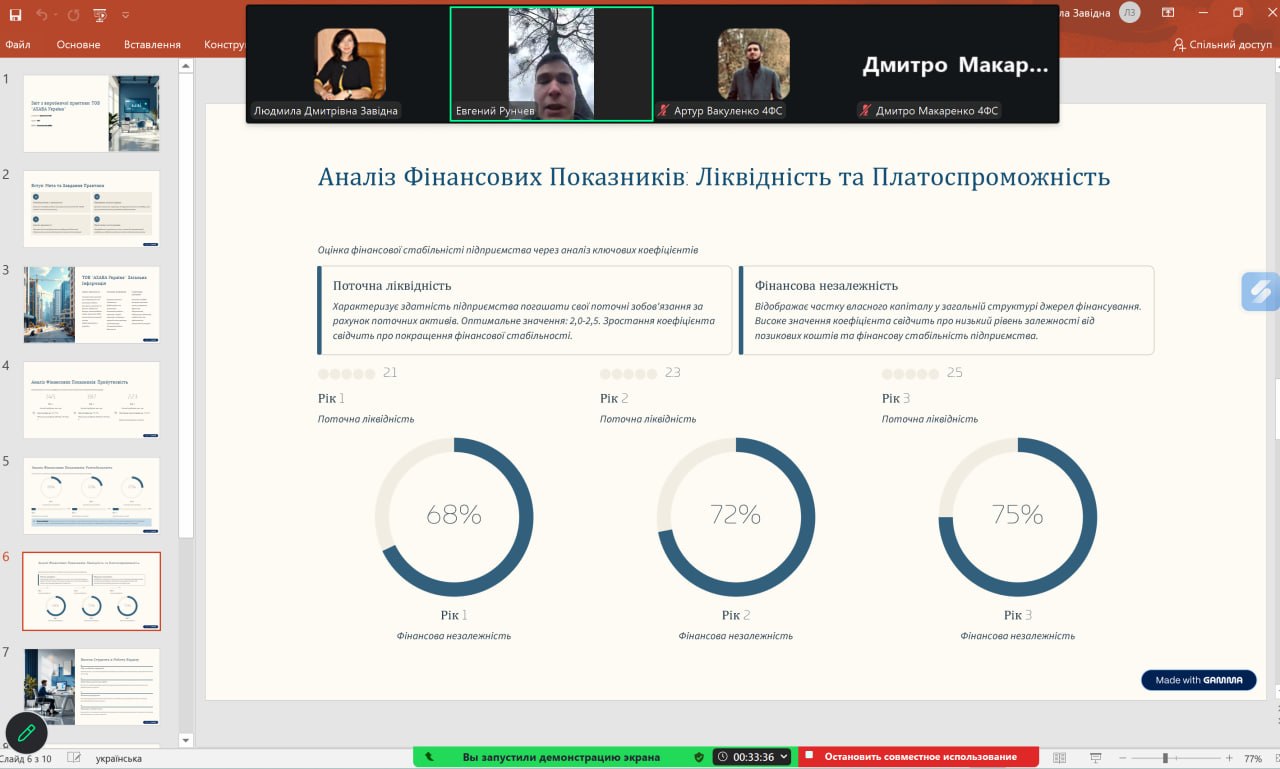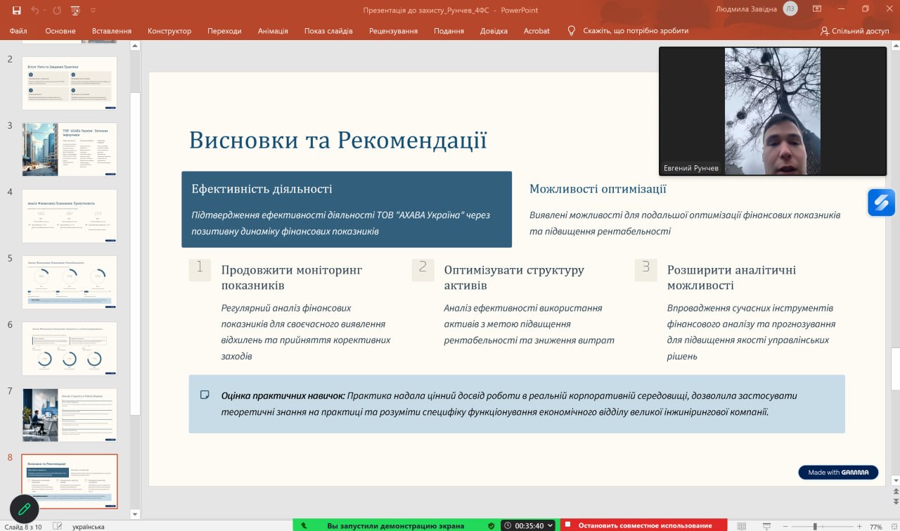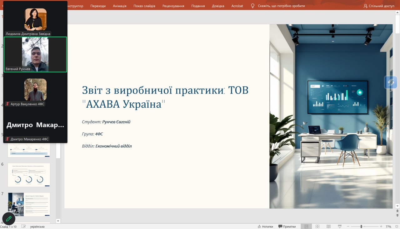 За результатами практики здобувачі підготували звіти, захист яких відбувався протягом березня 2026 року. Під час захисту були представлені цікаві та змістовні доповіді, у яких здобувачі висвітлювали особливості діяльності баз практики, надавали оцінку фінансовому стану підприємств, визначали проблемні аспекти та пропонували шляхи їх вирішення. Окрему увагу було приділено сучасним викликам фінансової системи, цифровізації фінансових процесів та підвищенню ефективності управління ресурсами.