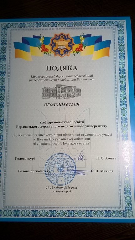 20–23 квітня 2016 р. у Кіровоградському державному педагогічному університеті імені Володимира Винниченка відбувся другий етап Всеукраїнської студентської олімпіади зі спеціальності «Початкова освіта».