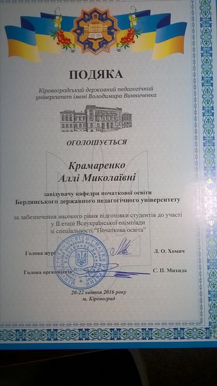 Не залишилася поза увагою журі й оргкомітету другого етапу Всеукраїнської студентської олімпіади зі спеціальності «Початкова освіта» діяльність викладачів кафедри початкової освіти (модератор – доц. Л. Чемоніна) і завідувача кафедри початкової освіти (проф. А. Крамаренко), яким було оголошено подяку за забезпечення високого рівня підготовки студентів до участі в названому вище конкурсі.