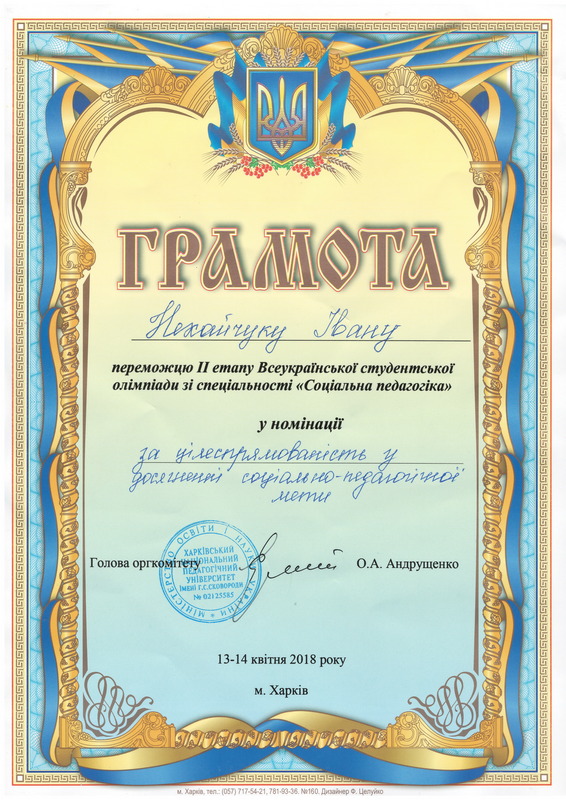 Факультет дошкільної, спеціальної та соціальної освіти вітає Івана Нехайчука, студента 4-го курсу спеціальності «соціальна педагогіка» з перемогою у ІІ етапі Всеукраїнської студентської олімпіади зі спеціальності «Соціальна педагогіка» у номінації «за цілеспрямованість у досягненні соціально-педагогічної мети».