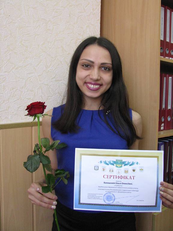 Бердянський державний педагогічний університет представляли студенти 401 групи ІСПКО Ольга Давиденко та Ольга Балашова. Дівчата блискуче справилися із численними завданнями та за загальними результатами увійшли до групи лідерів. Ольга Давиденко посіла друге місце, а Ольга Балашова – дев’яте. Це спільна перемога і дівчат, і викладачів кафедри дошкільної освіти, які у черговий раз продемонстрували високу якість підготовки майбутніх педагогів дошкільного фаху.
