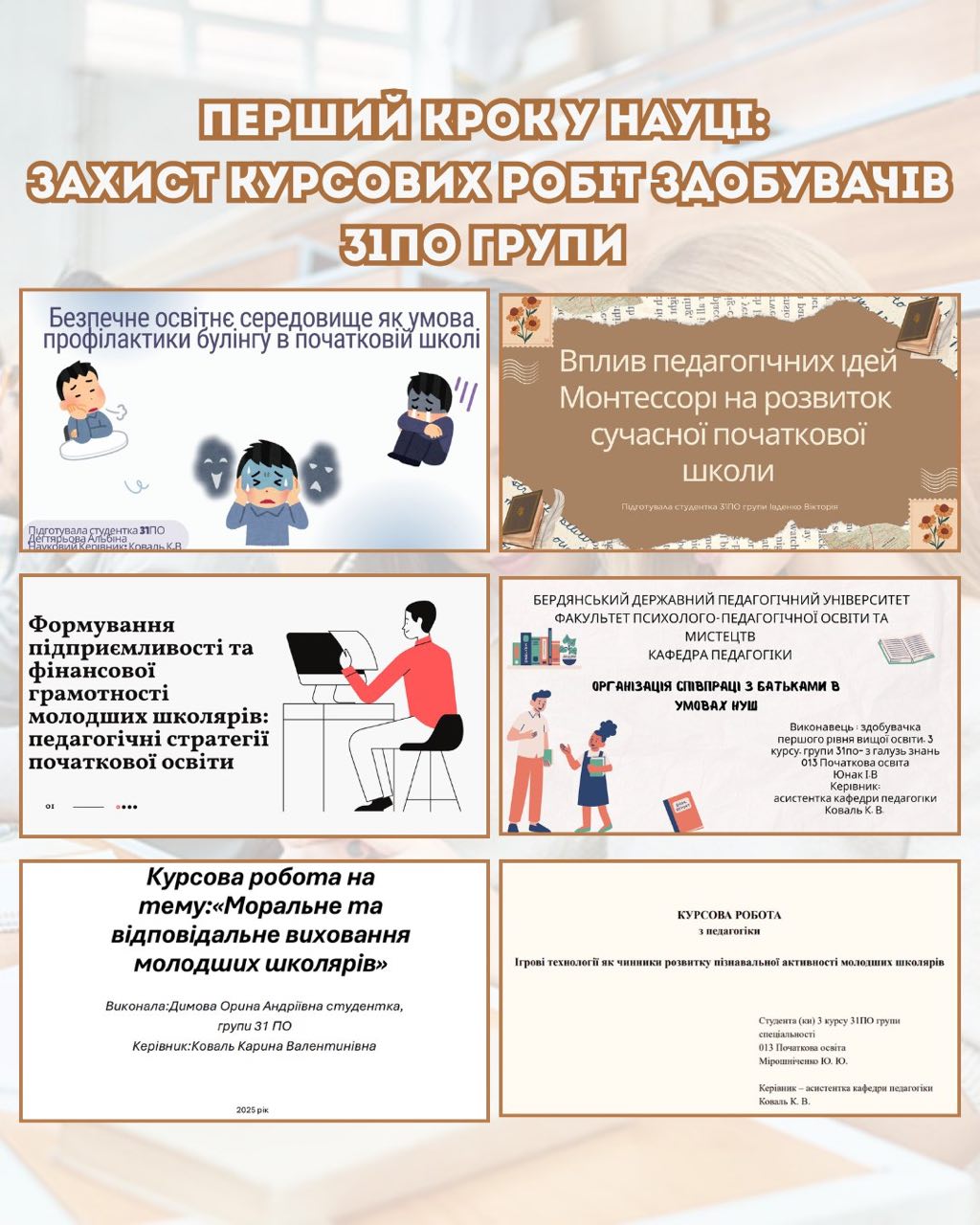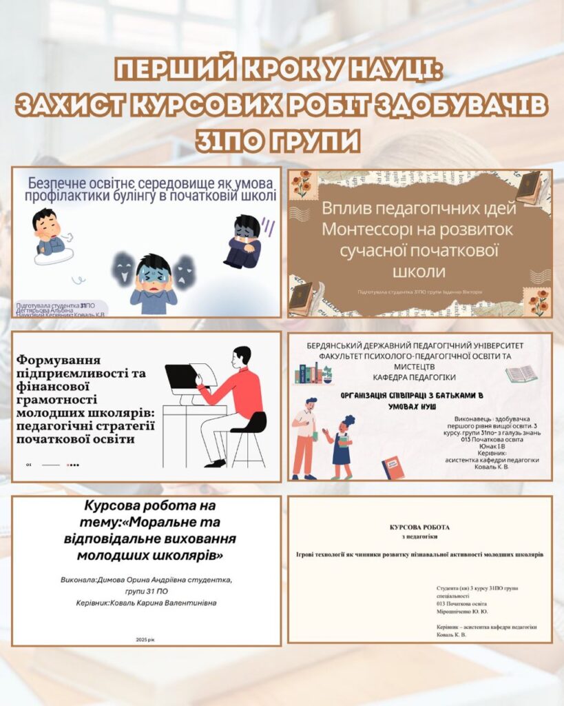 Захист курсових робіт засвідчив сформованість у майбутніх педагогів здатності до наукового аналізу, самостійного мислення та аргументованого представлення результатів власних досліджень. Представлені роботи продемонстрували не лише теоретичну освіченість здобувачів, а й уміння застосовувати наукові підходи для розв’язання актуальних освітніх завдань.