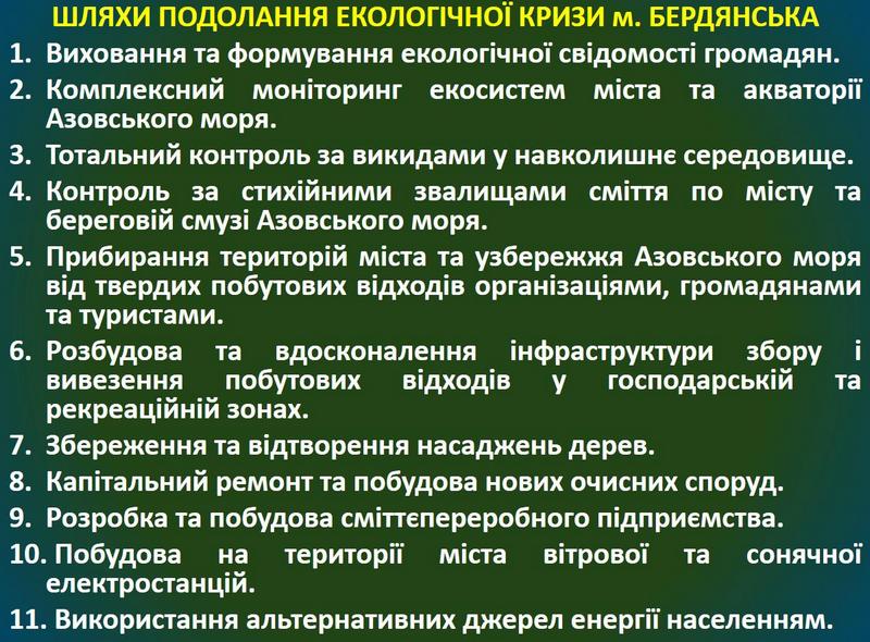 Також із доповіддю про «Екологічний стан Бердянська та Азовського моря» виступив еколог Віталій Гнатюк, комплексно представивши екологічні проблеми міста та моря, які безпосередньо впливають на стан навколишнього середовища усього регіону, запропонував низку заходів для подоланню цих проблем.