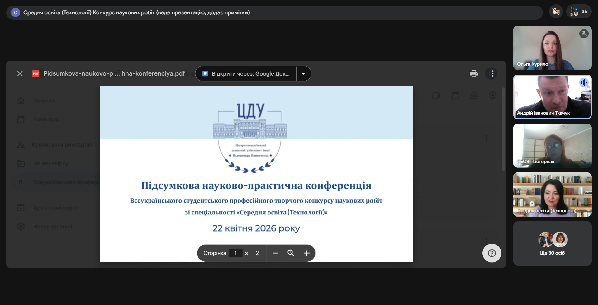 22 квітня 2026 року відбулася підсумкова науково-практична конференція Всеукраїнського студентського професійного творчого конкурсу наукових робіт зі спеціальності «Середня освіта (Технології)». Захід проходив у режимі відеоконференції на базі Центральноукраїнського державного університету імені Володимира Винниченка та об’єднав здобувачів вищої освіти і науковців з різних регіонів України.