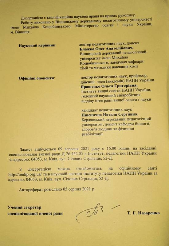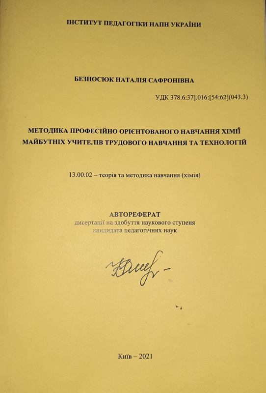 9 вересня на засіданні спеціалізованої вченої ради Д 26.452.05 в Інституті педагогіки НАПН України відбувся успішний захист дисертаційного дослідження Безносюк Н.С. на тему «Методика формування професійно орієнтованого навчання хімії майбутніх учителів трудового навчання та технологій» на здобуття наукового ступеня кандидата педагогічних наук за спеціальністю 13.00.02 – теорія та методика навчання (хімія) (науковий керівник – доктор педагогічних наук, доцент Блажко О.А., Вінницький державний педагогічний університет, завідувач кафедри хімії та методики навчання хімії).