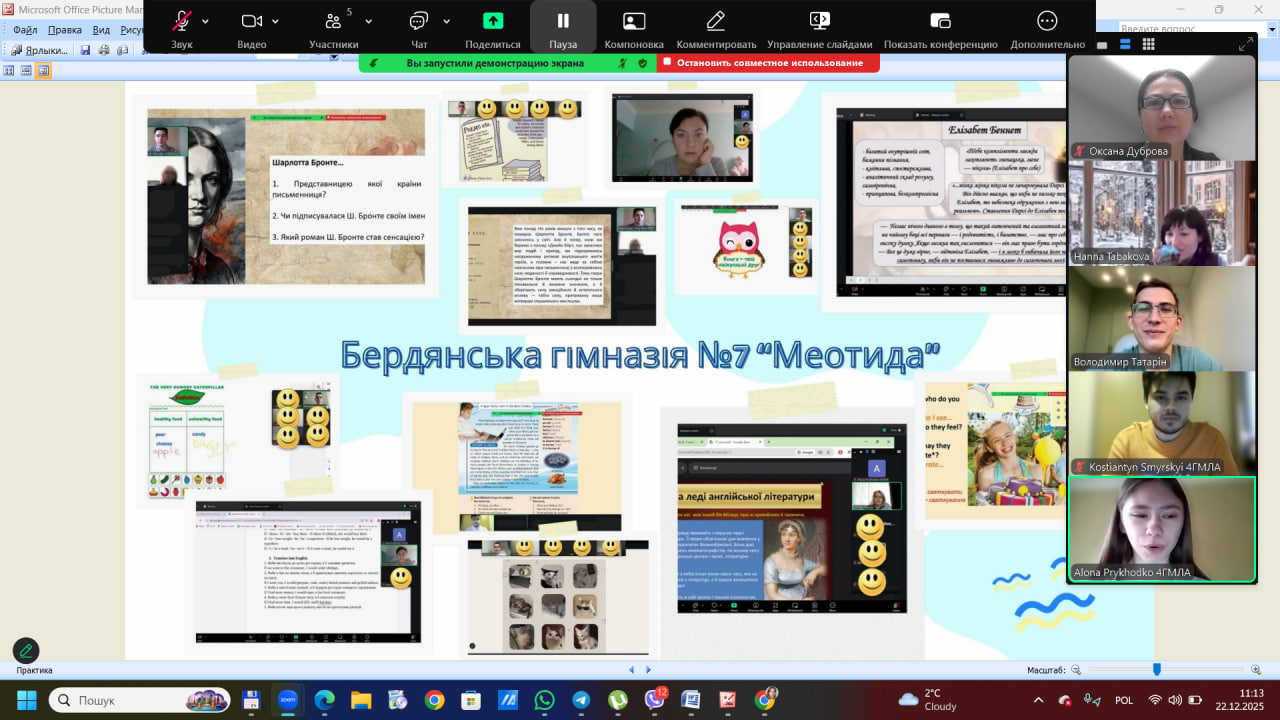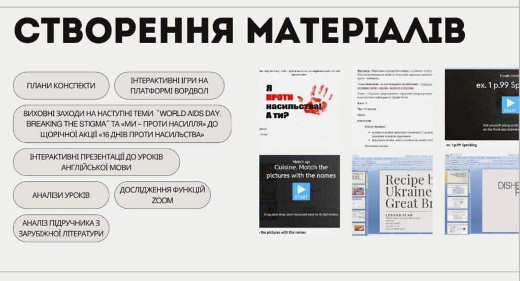 У межах уроків англійської мови особлива увага приділялася розвитку всіх мовленнєвих навичок учнів, включаючи говоріння, аудіювання, читання та письмо. На заняттях із зарубіжної літератури студенти знайомили учнів з творами світової літературної класики, розвивали навички літературного аналізу, критичного мислення та культурної компетентності. Виробнича практика завершилася успішно. Студенти-бакалаври продемонстрували високий рівень теоретичної підготовки та здатність застосовувати знання на практиці, уміння планувати та проводити уроки в дистанційному форматі, навички роботи з сучасними освітніми технологіями, педагогічний такт та здатність налагоджувати контакт з учнями, а також творчий підхід до організації навчального процесу.