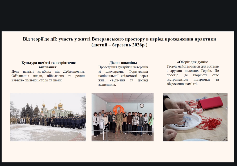 Практика стає не просто частиною освітнього процесу – вона перетворюється на простір формування професійної ідентичності. Саме тут з’являється усвідомлення: соціальна робота в поствоєнний період – це про відновлення не лише людей, а й сенсів.