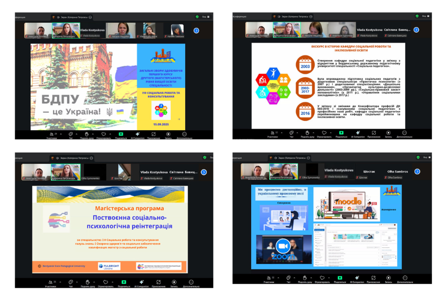 Упродовж першого навчального тижня нового навчального року для здобувачів першого курсу магістратури спеціальності І10 Соціальна робота та консультування денної та заочної форм здобуття освіти кафедра соціальної роботи та інклюзивної освіти, за ініціативи завідувачки кафедри Катерини Петровської та гаранта освітньо-професійної програми «Поствоєнна соціально-психологічна реабілітація» (гарант – доцент Анастасія Попова), організувала та провела загальні збори.