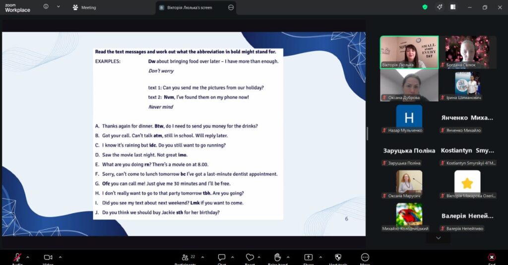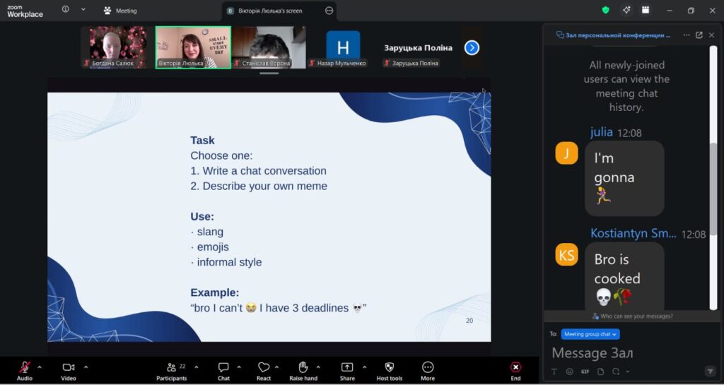 Лекція включала інтерактивні завдання. Зокрема, учасникам було запропоновано на вибір: скласти діалог у форматі чат-переписки або описати власний мем, використовуючи сленг, емоджі та неформальний стиль спілкування. Такий формат дозволив не лише закріпити теоретичний матеріал, а й на практиці відчути, як функціонує сучасна цифрова англійська мова.