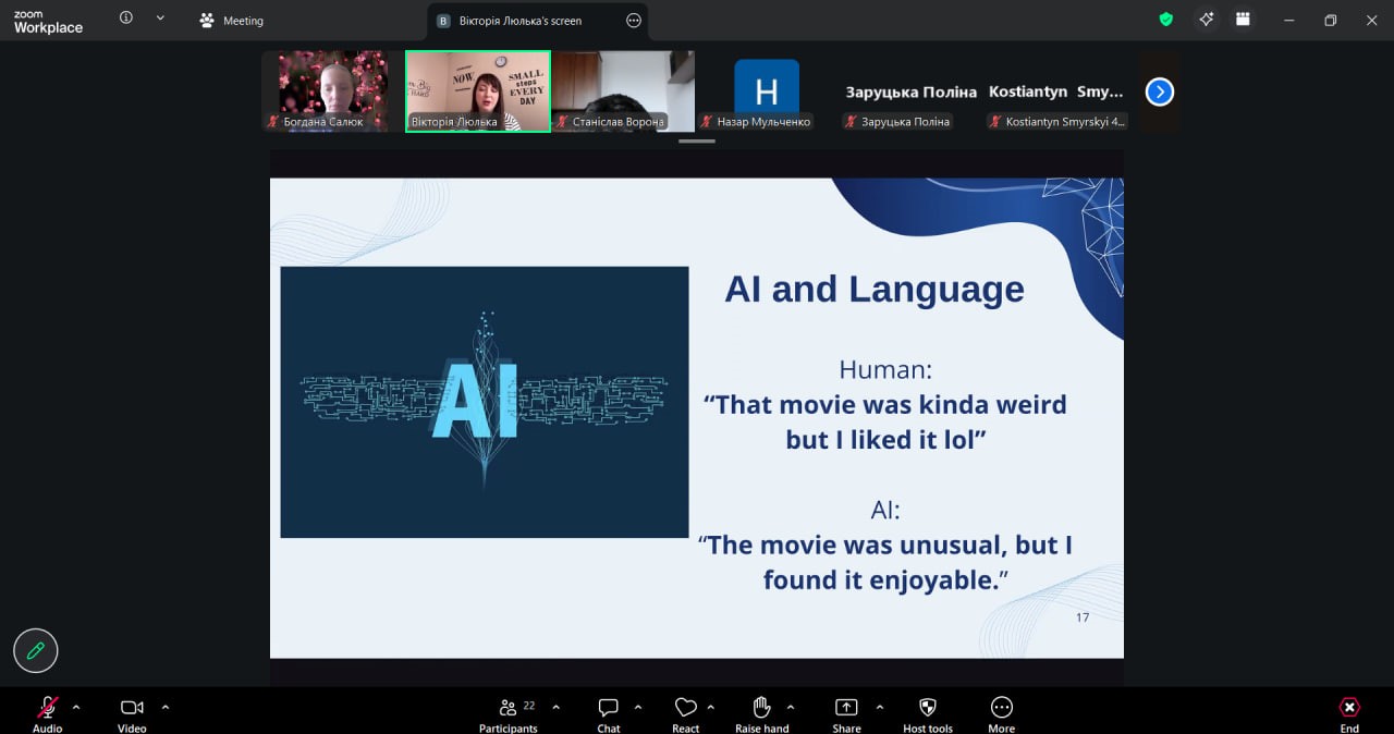 Тема «How Digital Technologies Are Changing the English Language: From Memes to Chatbots» викликала жвавий інтерес аудиторії. Лекторка розглянула, яким чином цифрові технології, зокрема меми, емоджі, соціальні мережі та чат-боти, трансформують лексику, граматику та практики онлайн-комунікації англійською мовою.
