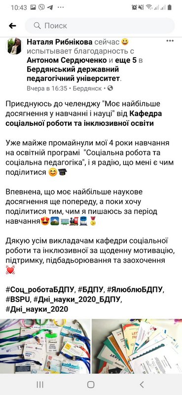 З 13 травня стартувала онлайн вікторина «Науковий та навчальний lifestyle» у соціальній мережі Facebook – принципово нова та інноваційна для БДПУ форма активізації студентських наукових досліджень, яку розробила та впровадила старший викладач кафедри Анастасія Сергіївна Попова у 2019 році. Онлайн вікторина тривала з 13 травня 12.00 до 16 травня 18.00, у рамках чіткого дедлайну. Метою вікторини було активізувати пошуково-дослідницькі навички здобувачів вищої освіти у контексті знання про науковий та навчальний стиль життя своїх викладачів та студентів БДПУ, а також навчити працювати у чітко визначених часових рамках. Переможцем вікторини стала Наталя Рибнікова, здобувачка першого (бакалаврського) рівня вищої освіти 4-го курсу зі спеціальності 231 «Соціальна робота».