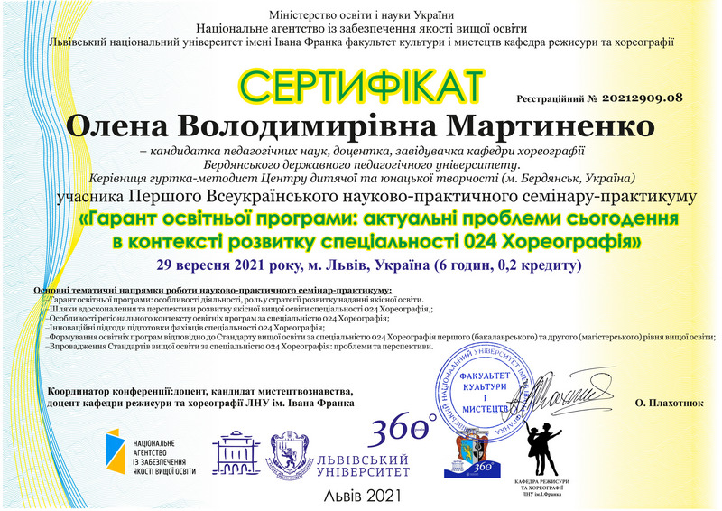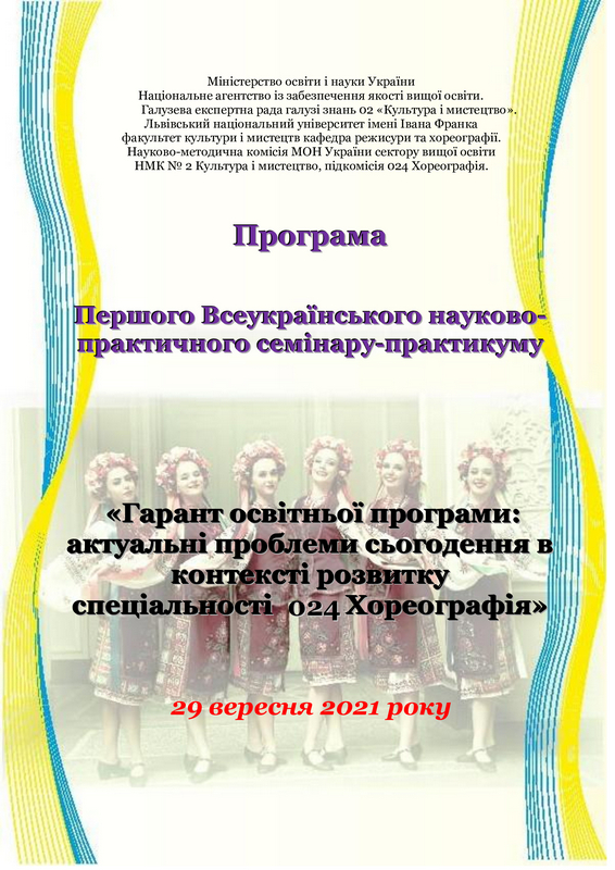 29 вересня відбувся перший Всеукраїнський науково-практичний семінар-практикум «Гарант освітньої програми: актуальні проблеми сьогодення в контексті розвитку спеціальності 024 Хореографія». У заході, ініційованому представниками експертного середовища оцінювання освітніх програм і галузевою експертною радою з галузі 02 Культура і мистецтво, узяли участь усі, кого цікавить проблема якості освітніх програм: гаранти освітніх програм, стейкхолдери і практики (керівники танцювальних колективів, гуртків і центрів творчості), науково-педагогічні працівники закладів вищої, передвищої та середньої освіти з усіх регіонів України.