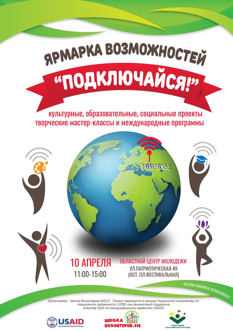 10 квітня ц. р. в Запорізькому обласному Центрі Молоді відбувся ярмарок можливостей «Підключайся», організатором якого була Запорізька Школа Волонтерів № 612.