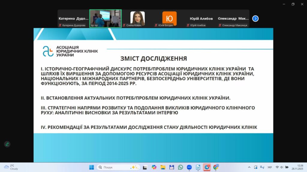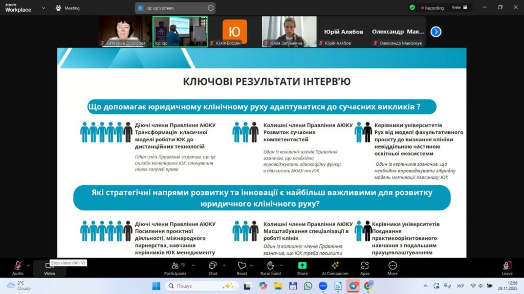 Членкиня правління АЮКУ Лілія Амелічева та експертка АЮКУ Юлія Саєнко презентували на заході результати аналітичного дослідження «Юридичні клініки правничих шкіл України: досвід, проблеми та міжнародні партнерства».