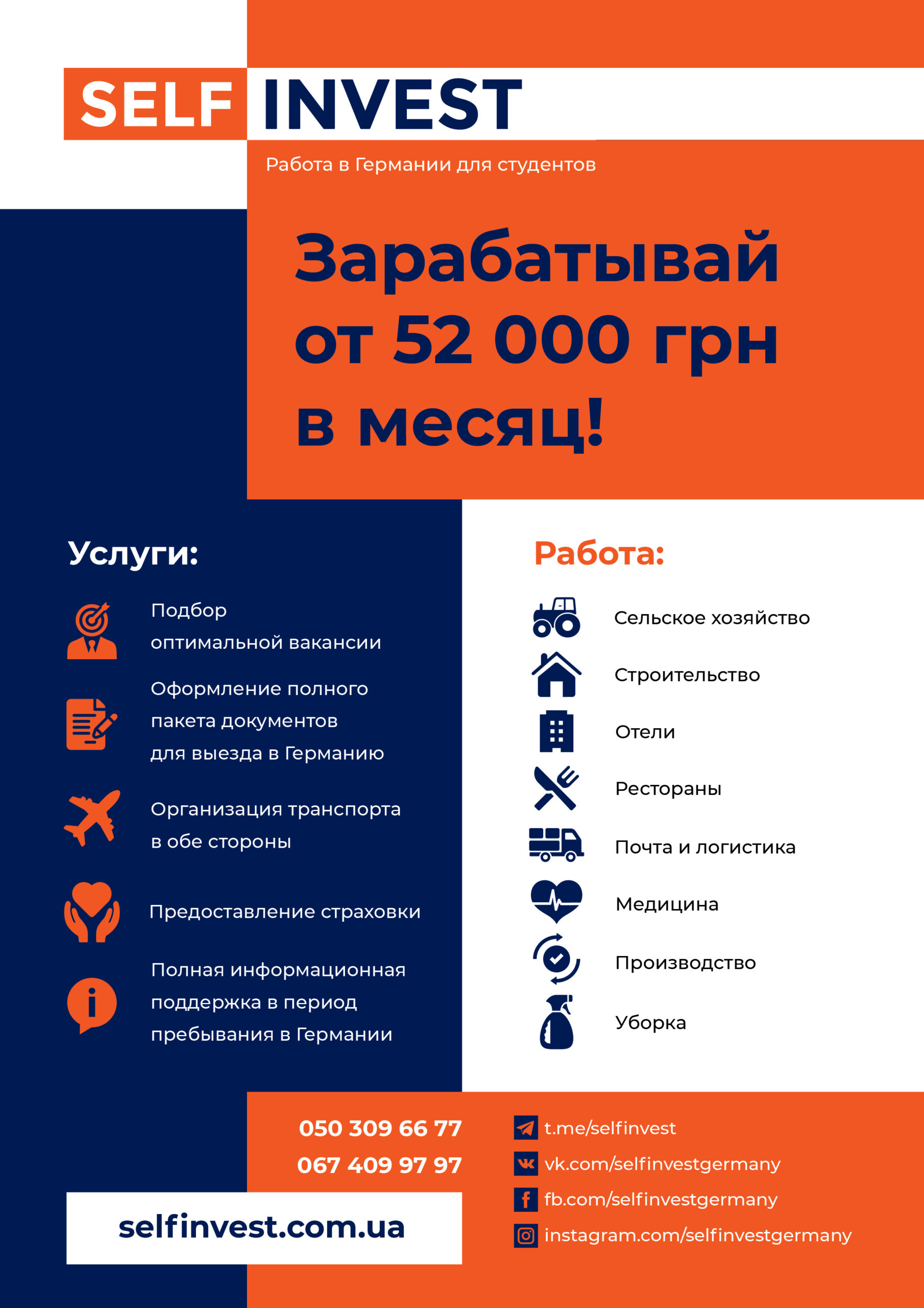 26 квітня 2018 р. о 12:50 в ауд. 142 відбудеться зустріч з керівництвом компанії «SelfInvest», яка пропонує студентам усіх факультетів можливості тимчасового (зокрема, під час канікул) працевлаштування в Німеччині у таких сферах як сільське господарство, готельно-ресторанна справа, виробництво, пошта/логістика, клінінгова справа, будівництво. Запрошуються всі зацікавлені студенти.