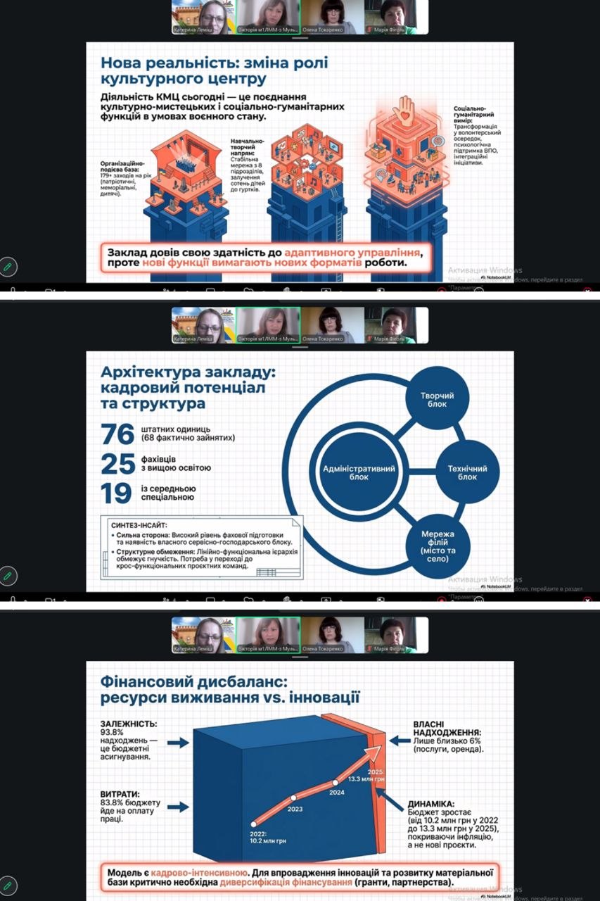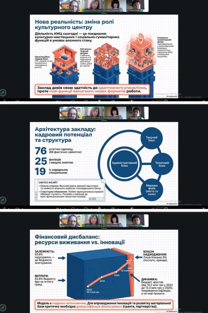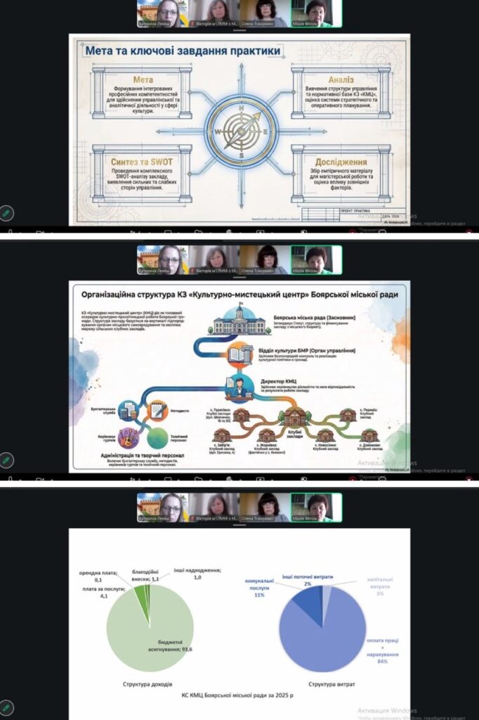 У межах звітної процедури здобувачі представили результати виконання індивідуальних програм практики, що передбачали поєднання науково-дослідної діяльності з практичним досвідом у сфері культурно-мистецького менеджменту. Доповіді супроводжувалися презентаціями, аналітичними матеріалами та прикладами змодельованих проєктів.
