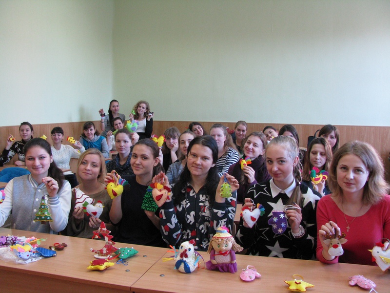 На початку грудня ц. р. студенти і викладачі факультету дошкільної, спеціальної та соціальної освіти мали прекрасну нагоду залучитися до благодійної акції «Подаруй новорічну іграшку дітям», яка стала вже традиційною на факультеті, та своїми руками створити новорічний подарунок для знедолених дітей. Виготовлені новорічні вироби – ялинки, півники, зірочки, рукавички, дзвоники та багато інших були яскравими, неповторними, оригінальними та викликали щасливі посмішки оточуючих. Іграшки, зроблені власноруч, подарували всім присутнім гарний настрій і бажання виготовляти такі прикраси разом із дітьми в дошкільних закладах та сім’ях.