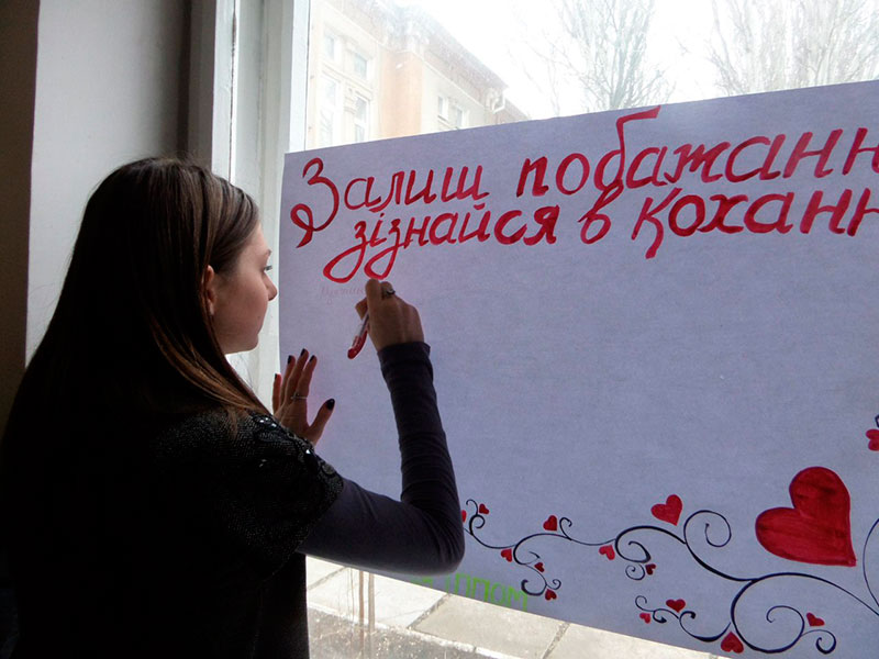 На великій перерві осередок кохання перемістився до 5Б корпусу, де кожний зі студентів мав можливість анонімно чи відкрито залишити своє зізнання в коханні, привітати інших та поділитися шматочком свого почуття. Маленькі Амурчики забавляли студентів гумористичною акцією, де бажаючі могли визначитися з своєю другою половинкою… Варіанти були різноманітні: від привабливої касирки АТБ до Меган Фокс, а дівчат полонив Иэн Сомерхолдер та Бред Пітт, Микита Джигурда та інші. Працювала й пошта кохання, завдяки якій студенти отримували довгоочікувані Валентинки (див. світлини).