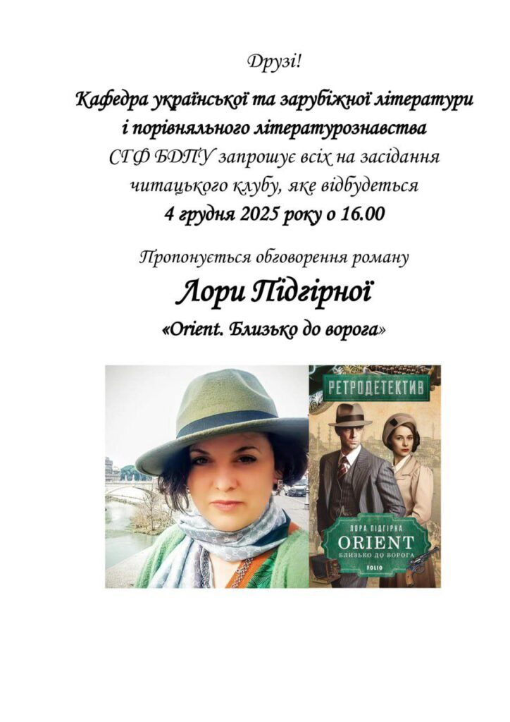 Запрошуємо на засідання читацького клубу, де планується  обговорення роману Лори Підгірної «Orient. Близько до ворога».