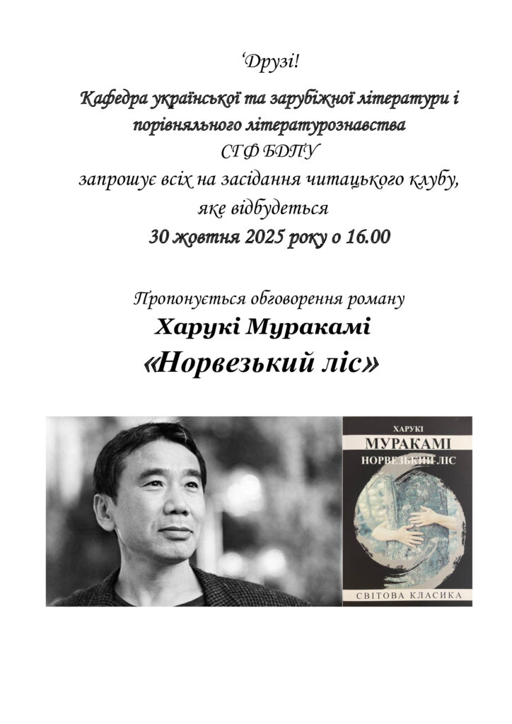 6 листопада 2025 року у на кафедрі української та зарубіжної літератури і порівняльного літературознавства соціально-гуманітарного факультету відбулося чергове засідання читацького клубу, під час якого учасники обговорювали роман японського письменника Харукі Муракамі «Норвезький ліс».