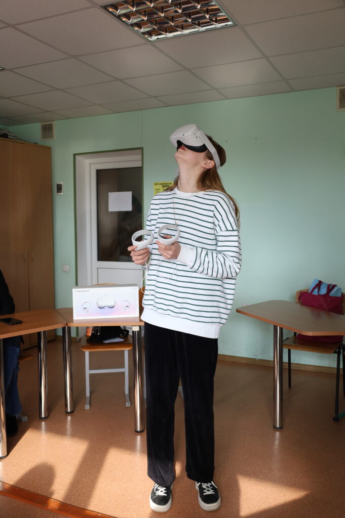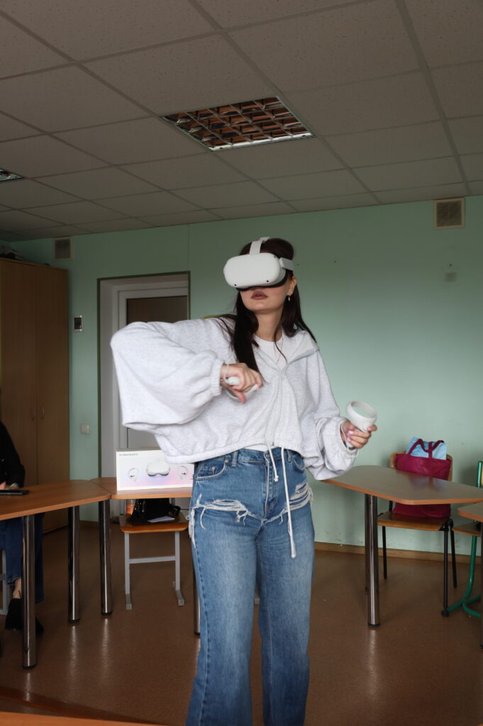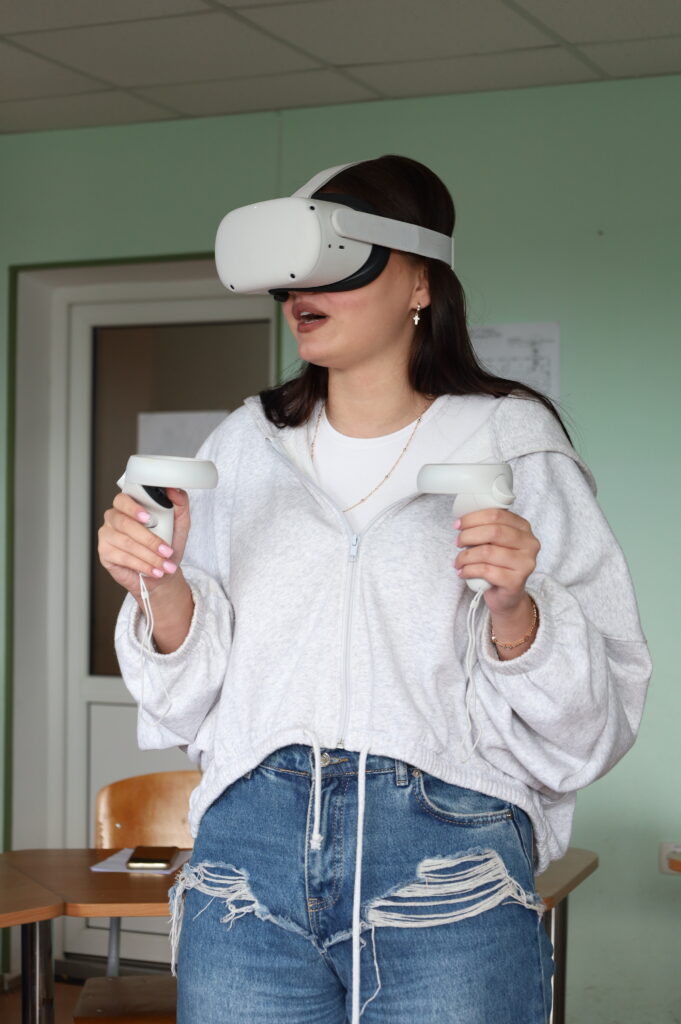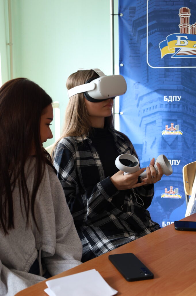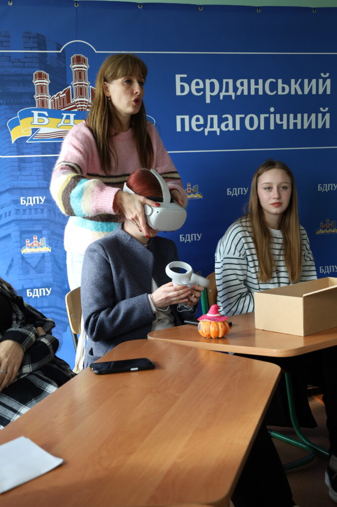 У межах цієї зустрічі доцентка кафедри початкової освіти Марина Нестеренко провела пізнавальний майстер-клас із дослідження можливостей віртуальної реальності. Для більшості учасників це був перший досвід взаємодії з VR-окулярами. Учасники тестували як розвивальні VR-застосунки (мандрівка у світ динозаврів, дослідження механізму дії алкоголю на мозок людини), так і розважальні програми, обговорюючи їхній потенціал для навчання та дозвілля. Після практичної частини розгорілося жваве обговорення – студенти активно ділилися враженнями, описували свої відчуття у віртуальному середовищі, аналізували переваги та ризики використання VR у різних сферах, зокрема – в освітній діяльності сучасного вчителя. Для кожного це стало точно незабутнім досвідом.