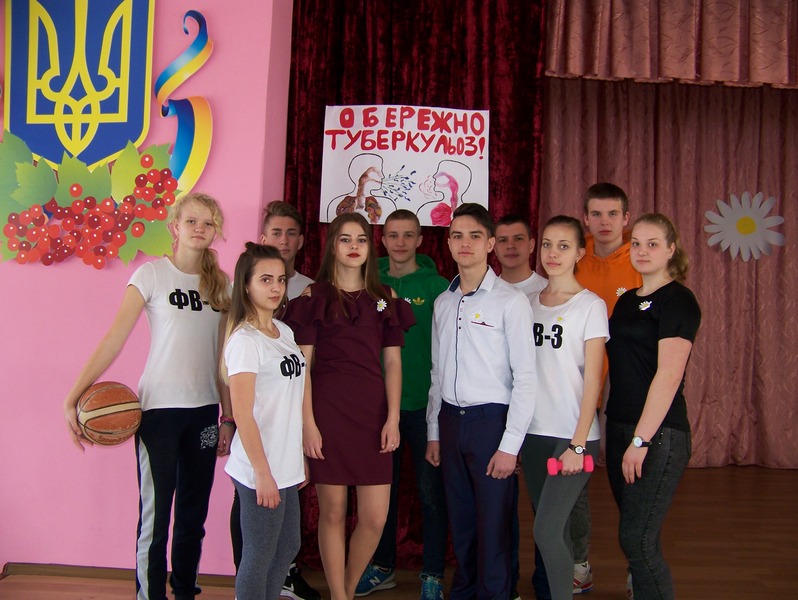 Студенти групи ФВ-3 показали інформційний фільм: «Туберкульоз – знай, стережись, не бійся», розповіли про хворобу та шляхи її подолання, провели цікаві ситуативні ігри: «Уяви себе лікарем фтизіатром та постав правильний діагноз», «Гра вірю-не вірю», «Асоціативна ромашка».