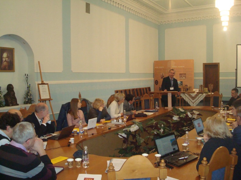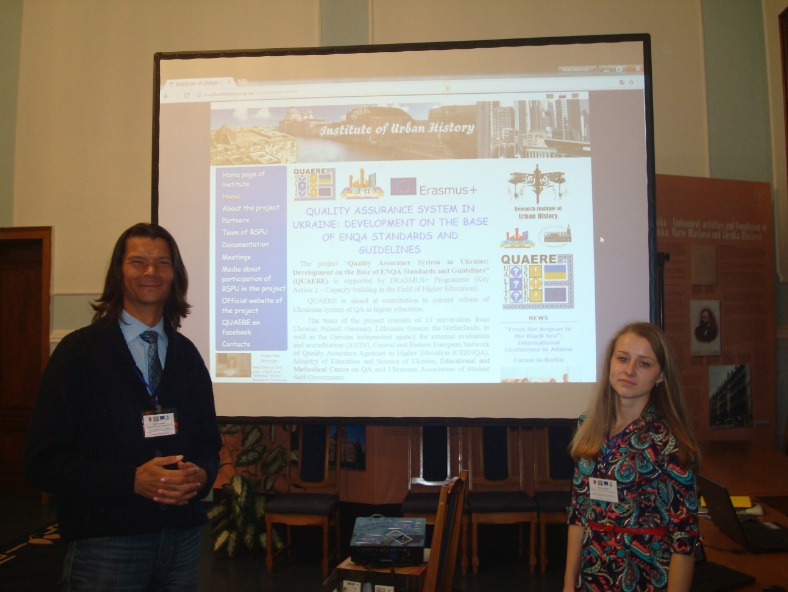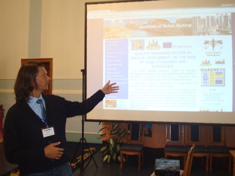 Члени проектної групи Бердянського державного педагогічного університету Ігор Лиман, Ольга Шубіна та Яна Лагута презентували іншим учасникам проекту доповідь “Structure and functionality of internal QA in BSPU”, а також розроблену НДІ Історичної урбаністики тримовну рубрику сайту з матеріалами про проект.