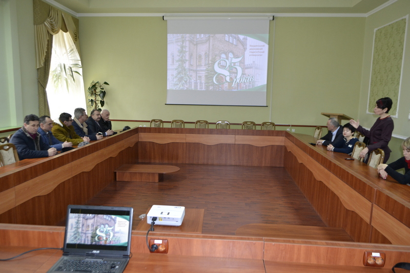 Гостей зустрічали, а згодом у конференц-залі знайомили їх із теперішніми здобутками університету: перший проректор БДПУ, професор Ольга Гуренко, проректор з науково-педагогічної роботи Вікторія Ліпич, голова комітету профспілки, депутат Бердянської міської ради Віталій Лола, декани факультетів, завідувачі кафедр, викладачі, переважна більшість з яких – випускники нашого університету.